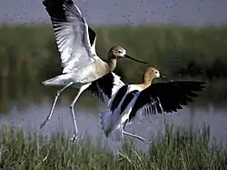 The high salinity in parts of the lake makes them uninhabitable for all but a few species, including brine shrimp, brine flies, and several forms of algae. The brine flies have an estimated population of over one hundred billion and serve as the main source of food for many of the birds which migrate to the lake.[53] However, the fresh- and salt-water wetlands along the eastern and northern edges of the Great Salt Lake provide critical habitat for millions of migratory shorebirds and waterfowl in western North America. These marshes account for approximately 75% of the wetlands in Utah.[54] Some of the birds that depend on these marshes include:[55] Wilson's phalarope, red-necked phalarope, American avocet, black-necked stilt, marbled godwit, snowy plover, western sandpiper, long-billed dowitcher, tundra swan, American white pelican, white-faced ibis, California gull, eared grebe, peregrine falcon, bald eagle, plus large populations of various ducks and geese.
