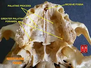 The greater palatine foramen is slightly larger than the lesser, and is positioned more anteriorly and laterally on the palatine bone, nearly bordering the maxilla.[1]