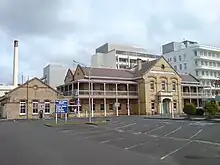Costley's bequest also funded the first hospital building, the Costley Home for the Aged Poor, which was opened in April 1890 by the Governor, the Earl of Onslow.[3][4] The Costley Home was a two story brick building with ornamental balustrades and a grand staircase.[3] Three brick buildings behind the main building contained dormitories;[1] these buildings were demolished in 1970 to make way for a new building.[5] One hundred and forty eight people were admitted when the Home opened with the number of patients increasing to 248 by 1918.[2]