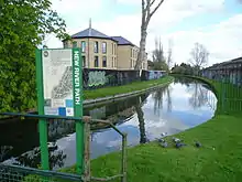 The New River flows under Green Lanes at Palmers Green, here shown looking east.