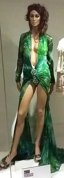 Designed by Donatella Versace, it has been described as "jungle green", "sea green" or "tropical" green, a green dress with touches of blue to give an exotic appearance. It is a see-through silk chiffon dress with a tropical leaf and bamboo pattern, with a citrine-studded crotch.[7] The dress "had a low-cut neck that extended several inches below her navel, where it was loosely fastened with a sparkly brooch and then opened out again," exposing her midriff and then cut along the front of the legs like a bath robe.[8] The dress then drooped behind her on the floor, open at the back.[8][9]