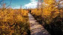 - Mer Bleue Conservation Area – 33 km2 (13 sq mi) sphagnum peat bog. There are some 20 km (12 mi) of walking trails, including a 1.2 km (0.75 mi) boardwalk, through a remarkable boreal-like ecosystem normally not found this far south. Stunted black spruce, tamarack, together with bog rosemary, blueberry, and cottongrass, are some of the unusual species that have adapted to the acidic waters of the bog. The Mer Bleue bog (French for Blue Sea) got its name from the autumn morning fogs that make it appear as a blue sea. 45°24′00″N 75°30′00″W / 45.40000°N 75.50000°W