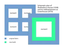 Plan (not to scale) of Shaftesbury House (1938) compared with Greenhouse (2010).