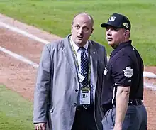Gibson speaks with an MLB official requesting a fan's removal from World Series game