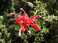 This grevillea is listed as Critically Endangered on the IUCN Red List of Threatened Species due to a population decline of at least 80% over the past 60 years due to a combination of factors such as land clearing for agriculture and roads and the invasion of weeds.[1] It is also listed as "Priority Four" by the Government of Western Australia Department of Biodiversity, Conservation and Attractions,[3] meaning that is rare or near threatened.[8]