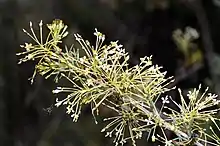Grevillea hortiorum is an erect, open shrub typically 0.7–3 m (2 ft 4 in – 9 ft 10 in) high and 1.0–1.3 m (3 ft 3 in – 4 ft 3 in) wide and has a smooth, grey trunk. The leaves are 10–30 mm (0.39–1.18 in) long and wide in outline, and divided with up to five lobes, often divided again, the end lobes linear, 5–10 mm (0.20–0.39 in) long and 0.5–0.8 mm (0.020–0.031 in) wide and sharply pointed. The flowers are arranged in sometimes branched clusters, each cluster more or less spherical or shortly cylindrical with 18 to 22 flowers on a rachis 15–17 mm (0.59–0.67 in) long. The flowers are white, the pistil 4.0–4.5 mm (0.16–0.18 in) long. Flowering mainly occurs from late winter to spring and the fruit is an oblong follicle 8–10 mm (0.31–0.39 in) long.[1][2]