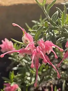 • Grevillea lavandulacea subsp. rogersii (Maiden) Makinson[9] that differs from the autonym in having a finely grainy upper surface of the leaves, the longest leaves more than 10 mm (0.39 in) long, and usually more than four flowers in each cluster.[10]