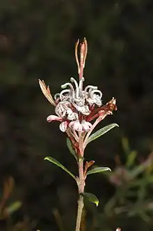 Grevillea sphacelata is a spreading to erect shrub that typically grows to a height of 0.4–2.5 m (1 ft 4 in – 8 ft 2 in) and has silky-hairy branchlets. The leaves are narrowly linear to oblong, 7–35 mm (0.28–1.38 in) long and 2–4 mm (0.079–0.157 in) wide with the edges turned down or rolled under. The upper surface of the leaves is glabrous and the lower surface is silky-hairy. The flowers are arranged in umbel-like clusters, the flowers at the ends of the clusters flowering first. The flowers are pale brown and pink, covered with greyish hairs, the pistil 9–12 mm (0.35–0.47 in) long, the style pinkish-grey. Flowering mainly occurs from July to January and the fruit is an oval follicle 18–20 mm (0.71–0.79 in) long.[2][3][4]