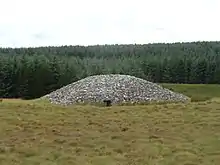 Camster Round is, as the name suggests, a circular cairn; it measures 18 metres (59 ft) in diameter by 3.7 metres (12 ft) high.[2] Its form may be similar to that of the original separate round cairns that were later amalgamated into Camster Long.[1] It is virtually intact with a high vaulted chamber at its centre, accessed from a passage 6 metres (20 ft) long and 0.8 metres (2 ft 7 in) high at the east-south-east side of the cairn. The passage appears to have been deliberately put out of use by blocking it up with stones piled up to the height of its roof. When it was excavated, archaeologists found that the floor of the cairn was composed of a 0.3 metres (1 ft 0 in) deep layer of black earth, ash and burnt bones. It appears that bodies were placed there in a sitting position, though, oddly, without leg bones; the legs appear either to have been removed or to have rotted off before the bodies were deposited in the cairn.[2]