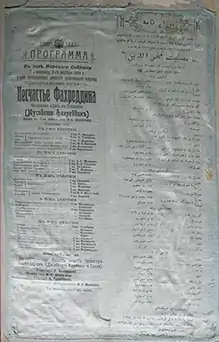![]() The tragedy’s program on silk with the participation of Huseyn Arablinski. Azerbaijan State Theatre Museum in Baku | |