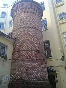 Griffins' tower (Russian: Башня грифонов) is a red-brick tower situated in one of the yards on Vasilyevsky Island in Saint Petersburg. It used to be a part of a 19th-century pharmacy factory run by famous pharmacist and alchemist Wilhelm Poehl (sometimes written William Pell). The tower is around 11 m high and 2 m wide and has no windows or doors. Almost every brick of the tower is numbered. The mysterious code and unusual location at the pharmacy yard caused numerous legends about the tower.
