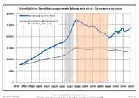 Development of population since 1875 within the current boundaries (Blue line: Population; Dotted line: Comparison to population development of Brandenburg state; Grey background: Time of Nazi rule; Red background: Time of communist rule)