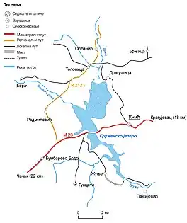Gruža Lake (Serbian: Гружанско језеро, romanized: Gružansko jezero), is an artificial lake located to the southwest of Knić, Serbia. The lake was created in 1983 as a water reservoir for the city of Kragujevac and the surrounding settlements.[1][2] The lake covers an area of approximately 9.19 km2, making it the largest body of water in Central Serbia.
