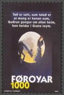 Her mother Grimhild[11] asked her sons Gunnarr and Högni what kind of wergild they would like to give their sister for the killing of her husband Sigurd and her son Sigmund, and they were both ready to compensate their sister.[12] Guðrún met her mother, brothers and Valdar, the king of Denmark, and three men named Jarizleif, Eymoth and Jarizskar.[13]