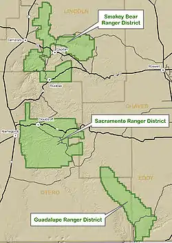 Guadalupe National Forest is a former National Forest in southern New Mexico. The Forest was originally established on April 19, 1907 by a Proclamation issued by President Theodore Roosevelt.[1] Led by inaugural Supervisor J. H. Kinney, the forest was initially based in Carlsbad, New Mexico, but within a year the headquarters was moved to Alamogordo.[2] Soon after, on July 2, 1908, President Roosevelt issued Executive Order 908. which consolidated the Guadalupe with the nearby Sacramento National Forest to create the Alamo National Forest.[3] Arthur M. Neal, the last supervisor of the independent Guadalupe forest became the initial supervisor for the new Alamo National Forest, with his headquarters in Alamogordo.[4] Under this new administrative scheme the former Guadalupe National Forest was renamed the Carson Seep Ranger District of the Alamo National Forest. On June 6, 1917, President Woodrow Wilson issued Executive Order 2633, which disestablished the Alamo National Forest and transferred all of its lands to the Lincoln National Forest.[5] As a result of this order, the Carson Seep Ranger District was renamed to its current designation, the Guadalupe Ranger District of the Lincoln National Forest, with its headquarters in Carlsbad.