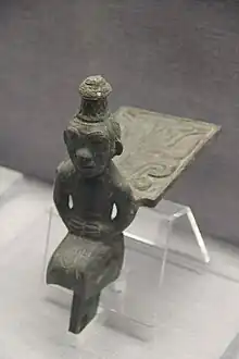 During the Warring States period, King Wuling of Zhao adopted the hufuqishe policy and a hufu-style guan, which looks similar to the conical hat of the Scythians, was adopted.[11] King Wuling's hufu-style guan was less pointy than the actual Scythian hat and he decorated his hat with a marten tail to denote his noble status.[11] The King of Qin later give the hufu-style guan of King Wuling to his servant as an insult to King Wuling after the latter had destroyed the regime of the Zhao state.[11] King Huiwen of Zhao later wore the same hufu-style guan as his father, King Wuling; and therefore this type of guan was named zhaohuiwenguan (Chinese: 趙惠文冠; pinyin: zhàohuìwénguān; lit. 'Crown of King Huiwen of Zhao').[11] Many years later, the zhaohuiwenguan evolved into the military cap called wuguan (Chinese: 武冠; pinyin: wǔguān; lit. 'military cap').[note 1][11]