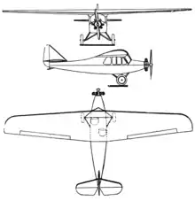 Like the wings, the fuselage was wooden, with six spruce longerons and ply surfacing. The Anzani engine had its cylinders uncowled, but its bearers were in an aluminium cowling back to a fire wall with the oil tank behind it. There were twin fuel tanks in the wing. A multi-windowed, enclosed cabin under the wing contained staggered seating fot two, the pilot in front on the left and their passenger/co-pilot provided with dual control.[1] There were doors on both sides of the cabin.[2] Behind the cabin and the wing trailing edge, the upper fuselage fell away smoothly to the tail. The T-2 had a triangular fin carrying an almost constant chord rudder which reached down to the keel. Its tapered, round-tipped tailplane was mounted at the base of the fin and carried separate elevators with a cut-out for rudder movement. All the tail surfaces had wooden structures and the control surfaces were unbalanced.[1]