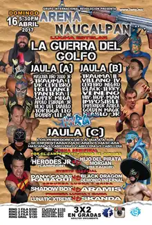 The Mexican wrestling promotion International Wrestling Revolution Group (IWRG; Sometimes referred to as Grupo Internacional Revolución in Spanish) has a long-standing history of holding major event focused on a multi-man steel cage match where the last wrestler left in the cage would be forced to either remove their wrestling mask or have their hair shaved off under Lucha de Apuestas, or "bet match", rules. In 2005 IWRG created a specific spring-time show promoting the steel cage match concept under the name Guerra del Golfo, or "Gulf War", referring to the Gulf of Mexico (not the Gulf War in the middle east).[2] The Guerra del Golfo shows featured two "qualifying" multi-man steel cage matches where the loser would later be forced to face off against each other in the main event of the show. In the final cage match the two wrestlers would wrestle where the loser would be forced to either unmask or, if they are not wearing a mask, have his hair shaved off. The use of the steel cage in three matches distinguishes the Guerra del Golfo event from other Steel cage matches held throughout the year such as the IWRG El Castillo del Terror ("The Tower of Terror"),[3][4] IWRG Guerra de Sexos ("War of the Sexes"),[5] or IWRG Prison Fatal ("Deadly Prison") shows.[6]