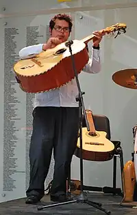 In this photo, the wooden bridge can be seen. A member of Citadino Son demonstrates a guitarrón at the Museo de Arte Popular, Mexico City, in 2012.