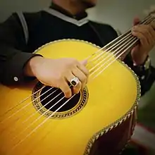 A close-up of a guitarrón being played.