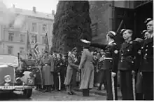 Quisling welcomes Terboven to Trinity Church (Norwegian: Trefoldighetskirken) in Oslo for Lunde's grand state funeral on 1 November 1942.