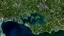 The Gulf of Morbihan (French: golfe du Morbihan, French pronunciation: [ɡɔlf dy mɔʁbiɑ̃]; Breton: Mor Bihan Gwened) is a natural harbour on the coast of the department of Morbihan in southern Brittany, France. Its English name is taken from the French version, le golfe du Morbihan, though it would be more precisely called 'the Morbihan' as its Breton name 'Ar Mor Bihan' means 'the little sea'. (Compare the Welsh y môr bychan), as opposed to the Atlantic Ocean outside, (Ar Mor Bras). Legend says that there are as many islands in the Gulf as there are days of the year. In fact the gulf has about 40, depending on the tides. Many islands are private property, except the largest two, Île-aux-Moines and Île-d'Arz.