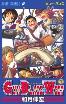 Written and illustrated by Nobuhiro Watsuki, Gun Blaze West was serialized in Shueisha's shōnen manga magazine Weekly Shōnen Jump from December 11, 2000,[lower-alpha 1] to July 31, 2001.[lower-alpha 2] Shueisha collected its chapters in three tankōbon volumes published from June 4 to November 2, 2001.[10][11] Shueisha re-released the series in a two-volume bunkoban edition from August 18 to September 16, 2011.[12][13]