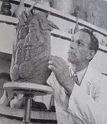 Gunnar Nylund (1 May 1904–1997) was a Swedish ceramic designer since the 1930s, best known as the artistic director of Rörstrand, and was already a well-established ceramic artist in Denmark first at the Bing & Grøndahl Porcelain factory in Copenhagen 1925–28. Later, in 1928, in collaboration with chemist Nathalie Krebs, he started a ceramics workshop, which became Saxbo in 1930, which kept making his stoneware until 1932. Nylund worked for Rörstrand from 1931–1955, the majority of the time as artistic director. He became well known for his new matte feldspar glazed stoneware in hare's fur and crystal glazes and for his stoneware animal sculptures.