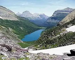 Gunsight Lake is located in Glacier National Park, in the U.S. state of Montana. The lake is surrounded by high peaks including Fusillade Mountain to the north and Gunsight Mountain to the west. Mount Jackson rises more than 4,700 feet (1,400 m) above Gunsight Lake to the south.[2]