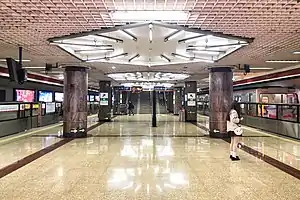 Guomao Station (simplified Chinese: 国贸站; traditional Chinese: 國貿站; pinyin: Guómào Zhàn) is an interchange station on Line 1 and Line 10 of the Beijing Subway at the China World Trade Center.[1] Guomao is the Chinese abbreviation for China World Trade Center. It is located in Chaoyang District. The station handled a peak passenger traffic of 359,800 people on May 5, 2013.[2]