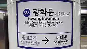 - ↑ "Search: Gwanghwamun". Seoul Metro. Retrieved 2019-07-14.