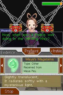 During the courtroom sections, the player attempts to get the defendant the correct verdict by questioning witnesses and presenting evidence to the judge and the prosecutor. Many witnesses lie or make errors during their testimonies; the player is able to move back and forth through the testimony to try to find any inconsistencies. There are two options available during cross-examinations: "press", which makes the player question a particular statement, which sometimes makes the witnesses change their testimony; and "present", which is used to show a piece of evidence or a character profile that the player thinks shows a contradiction in the witness's currently shown statement.[22] In the upper right corner of the screen, the player's health bar is shown, representing the judge's patience. The bar decreases if the player makes mistakes, such as presenting the wrong piece of evidence; if it reaches zero, the defendant is declared guilty, and the player loses the game. While the player cannot lose the game while trying to break a psyche-lock, the bar will still decrease if the player presents the wrong evidence while trying to break psyche-locks. 50% of the bar is restored when the player manages to break all psyche-locks on a topic, and 100% is restored when an episode is completed.[23]