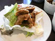 Gyūtan (牛タン) is a Japanese food that is made from grilled beef tongue. The word gyūtan is a combination of the Japanese word for cow (, gyū) and the English word tongue. Since gyūtan literally means "cow tongue," the word is also used to refer to cow tongues in Japan. The custom of cooking gyūtan originated in Sendai in 1948, and is usually served with barley rice, tail soup, and pickles in the Sendai area. In other areas in Japan, gyūtan is most often served in yakiniku restaurants. Gyūtan was originally conceived to be flavored with salt, which led to gyūtan being called tanshio (タン塩, lit. "tongue salt") in many yakiniku restaurants. However, some stores now serve gyūtan with tare sauce.