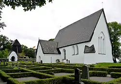 The church is a hall church with two windows in the southern wall and a group of three windows in the eastern wall of the choir, all original but later (18th century) enlarged. The attached vestry is original and contains traces of 14th century frescos, imitating masonry. A door with medieval iron decoration connects the church porch (c. 1480) and the church, and in the entrance door traces of the original, medieval cloth that once covered the door remain. Internally, the church is embellished with richly decorated vaults, created by Albertus Pictor.[1] [3]