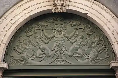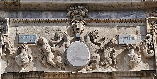 Works to build this house started in 1550 for Gaspard Molinier, a powerful man and long time member of the parliament. The entrance comprises a monumental gate surmounted with numerous sculptures, including monstruous beings and marble inlays. This ensemble corresponds to the then-new style known today as mannerism, whose principal traits are an abundance of sculpted figures, the depiction of a fantastic bestiary, and a marked taste for relief and polychromatic interplays.[1]