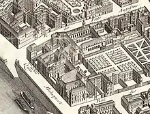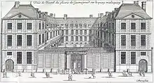 The site had been owned from 1628 by Auguste de Loménie, Sieur de la Ville-aux-Clercs, who had become the Count of Brienne from his marriage in 1623 to Louise de Béon. His hôtel is shown as Hôtel de Brienne on the 1652 Gomboust map of Paris. Subsequently it was known by other names, including Hôtel de Conti (1660–1670), Hôtel du Plessis-Guénégaud (1670–1680, engraved by Jean Marot), Hôtel de Créquy (1680–1712), Hôtel de Lauzun (1712–1733), Hôtel de La Roche-sur-Yon (on the 1739 Turgot map of Paris), and Hôtel Mazarin (during the reign of Louis XVI).[3] It became the property of the state during the French Revolution but in 1818 was returned to its former owners, who demolished it in 1843. The property was acquired by the École des Beaux-Arts in 1858, and Félix Duban began construction of the Bâtiment des Expositions, which was completed in 1862.[4]