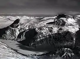 ![]() Aerial photograph taken over Memurudalen towards Gjende and Høgdebrotet in the upper right hand corner | |