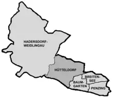 Hütteldorf (German pronunciation: [ˈhʏtl̩ˌdɔʁf] ⓘ; Central Bavarian: Hittldorf) is a part of Vienna's 14th district, Penzing. It is located in the west of Vienna, in the geographical center of the district, stretching roughly from Deutschordenstraße (which forms the border to Baumgarten) in the east to Wolf in der Au in the west, where Hütteldorf borders Hadersdorf-Weidlingau.