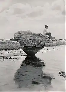 It is by using this method that Tilbrook was able to be in most of his well-known photographs, as well as including himself in many group photos from his trips. It is something he was to be known for after his self-portrait works began to be used on passenger trains around Adelaide. In his diary he recalls hearing a story of a lady who, after travelling on the train, remarked "I came up in a carriage with Mr Henry Tilbrook." When asked where he was going, the lady replied that she did not know, and that she "left him in the train. He was sitting on a rock – in a picture"[6]
