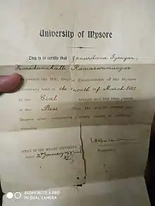 Janardhana Iyengar was one of the earliest fellows of the Institution of Engineers and chairman of the Institution's Mysore Local Centre[1] in 1966–67. He was a co-founder of the National Institute of Engineering and member of its Governing Council.[2] The NIE maintains an endowed scholarship in his memory, awarded to the student with the highest cumulative marks through all semesters.[3]