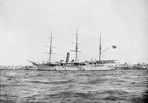 Glasgow was built in 1878 as a replacement for Sultan Bargash's fleet which had been lost in a hurricane in 1872.[1] Glasgow was based upon the British Royal Navy screw frigate HMS Glasgow which had impressed the Sultan during a visit to Zanzibar in 1873.[2] Bargash consulted with Sir William Mackinnon, the founder of the British-India Steam Navigation Company, who recommended the firm of William Denny and Brothers as shipbuilders.[2] On 17 April 1877 Denny wrote to Bargash's agents promising to build "a vessel in every way a handsome and substantial piece of work" and on 14 May 1877 the ship was laid down.[2] The vessel was constructed with an iron frame covered with teak planks and a keel made from rock elm, the hull was sheathed with Muntz metal below the waterline.[2] Glasgow was equipped with three masts and a steam propulsion system with a lifting propeller.[2] The vessel was launched on 2 March 1878.[2]
