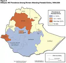 Ethiopia faces an epidemic among sub-populations and geographic areas, with an estimated overall HIV prevalence rate of 1.4 percent, based on testing a sample of 5,780 men and 5,300 women age 15 to 49 who gave informed consent. The reality in the actual population turns above 3.3%. Within the individual regions, this testing found the prevailing rate varied from 0.2 in the SNNPR to a high of 6.0 percent in the Gambela Region.[2] While previous estimations were higher, expansion of surveillance data and improved analyses resulted in significantly lower estimations for 2005. Based on the same survey, HIV prevalence has declined to about 3.2% from 4.7% percent in urban areas.3.3 % of Ethiopia population have affected by HIV in 2006.