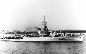 After working up in Bermuda in November 1944, Kirkland Lake was assigned to escort group EG 16 based out of Derry. She spent various periods based out of Portsmouth and Derry, escorting convoys to Gibraltar in May 1945. She returned to Canada in June 1945 to undergo a tropicalization refit in preparation for service in the southern Pacific Ocean.[2] This meant installing water-cooling and refrigeration abilities and changing the camouflage pattern.[6] The refit was done at Quebec City and completed 5 November 1945.[2] By this time, Japan had surrendered and the war was over.