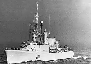 Saguenay underwent conversion from a destroyer escort (DDE) to a destroyer helicopter escort (DDH) at Burrard Dry Dock in Vancouver, British Columbia beginning 22 August 1963. Saguenay was officially reclassed and recommissioned on 14 May 1965.[16] The ship was sent to Halifax to work with the east coast fleet,[15] where she joined the First Canadian Destroyer Squadron.[16] On 16 July 1970 the ship ran aground off the coast of Cape Breton.[17] The ship was refloated the next day without sustaining any damage.[16] In April 1971, the ship transferred to the Fifth Canadian Destroyer Squadron.