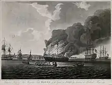Arethusa was part of a fleet under the command of Rear Admiral Sir Henry Harvey, commander-in-chief for the Navy in the Leeward Islands, aboard Prince of Wales, that in February 1797 captured the Spanish-held Caribbean island of Trinidad. The flotilla sailed from Carriacou on 15 February and arrived off Port of Spain the next day.[12] At Port of Spain they found a Spanish squadron consisting of four ships of the line and a frigate, all under the command of Rear-Admiral Don Sebastian Ruiz de Apodaca. Harvey sent Favourite and some of the other smaller ships to protect the transports and anchored his own ships of the line opposite the Spanish squadron. At 2am on 17 February the British discovered that four of the five Spanish vessels were on fire; they were able to capture the 74-gun San Domaso but the others were destroyed.[12][lower-alpha 3] Later that morning General Sir Ralph Abercrombie landed the troops. Captain Wolley of Arethusa superintended the landing.[13] The Governor of Trinidad, José Maria Chacón, surrendered the next day.[12] The flotilla shared in the allocation of £40,000 for the proceeds of the ships taken at Trinidad and of the property found on the island.[14]