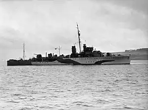 Fleetwood was recalled to Home waters following the outbreak of the Second World War, arriving at Portland on 11 October 1939 and was tasked with providing escort to convoys along the East coast of Britain.[11][12] In April 1940, Germany invaded Norway, with Fleetwood attached to the Home Fleet. She provided anti-aircraft cover for landings at Åndalsnes and Molde, and when the sloop Pelican was damaged by German bombs, Fleetwood towed the damaged ship back to Lerwick in Shetland. She then returned to Romsdalsfjord, relieving the damaged sloop Black Swan on 28 April. On 29 April she was near missed by a German bomb, which caused little damage,[13] and was herself relieved on 30 April by the sloop Auckland and the cruiser Calcutta, having fired all her anti-aircraft ammunition. Fleetwood evacuated 340 troops on her return to Britain.[14][11][12][15] On 11–12 May 1940 Fleetwood helped to land troops at Mo i Rana, and came under heavy air attack.[16] On 27 May 1940, Fleetwood helped escort the badly damaged destroyer Eskimo, which had her bow blown off at the Second Battle of Narvik, from Harstad back to Britain.[17]