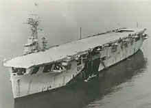 She had a traditional rivetted hull, steel flight decks and a closed hangar.[8] Propulsion was provided by diesel engines connected to two shafts giving 11,000 hp (8,200 kW), which could propel the ship at 17 kn (20 mph; 31 km/h).[7] Her armaments concentrated on anti-aircraft (AA) defence and comprised two 4 in (100 mm) dual purpose guns on a twin mount, sixteen 20 mm (0.79 in) AA autocannons on eight twin mounts and sixteen 2-Pounder "Pom Pom" AA guns on four quadruple mounts.[7] Aircraft assigned were either anti-submarine or fighter aircraft, which could be made up of a mixture of Hawker Sea Hurricanes, Grumman Martlets or Fairey Swordfish.[9]