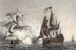 Northumberland was captured during the action of 8 May 1744[lower-alpha 1] by the French ships Mars commanded by Étienne Perier and Content commanded by the Comte de Conflans.[4] She was subsequently taken into the French navy as Northumberland, before being renamed Atlas in 1766.