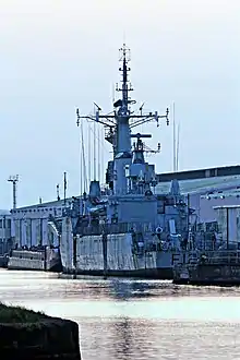 The ship was fitted with a Type 293Q surface/air search radar on the foremast, with a Type 277 height-finding radar on a short mast forward of the foremast. A Mark 6M fire control system (including a Type 275 radar) for the 4.5 inch guns was mounted above the ship's bridge, while a Type 974 navigation radar was also fitted.[10][11] The ship's sonar fit consisted of Type 174 search, Type 170 fire control sonar for Limbo and a Type 162 sonar for classifying targets on the sea floor.[11]