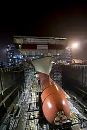 Prince of Wales was assembled at Rosyth from 52 blocks built by six shipyards around the UK. Construction began on 26 May 2011 with the first steel being cut at Govan shipyard by Defence Secretary Liam Fox.[26] In September 2014, Prince of Wales reached a final assembly phase when hull blocks LB02 and LB03 were floated into 1 Dock of Rosyth dockyard, Scotland.[27]